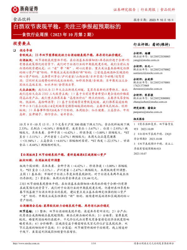 【浙商证券】【20231015】食饮行业周报(2023年10月第2期):白酒双节表现平稳,关注三季报超预期标的-14页 行业研究