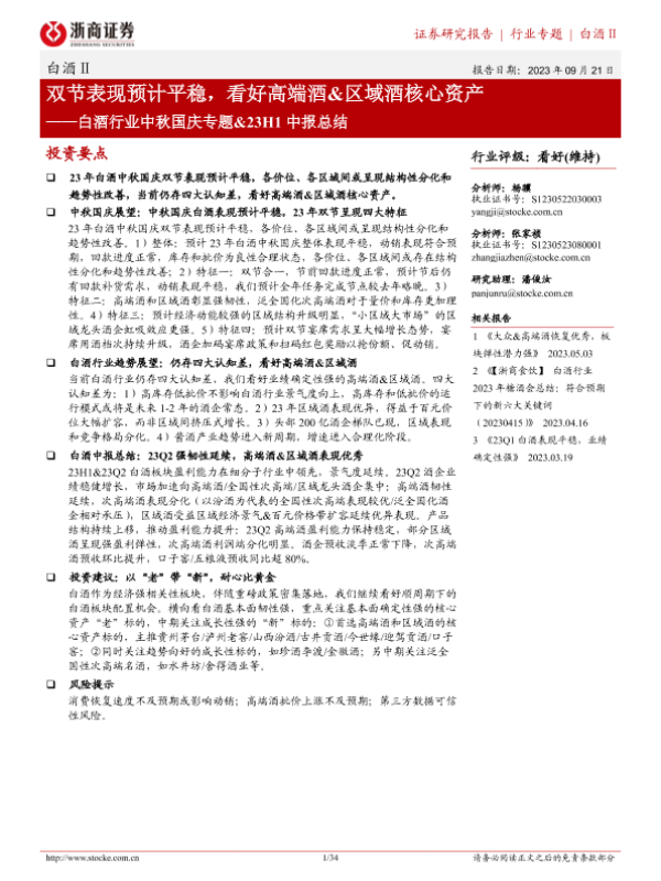 【浙商证券】【20230921】20230921-浙商证券-白酒行业中秋国庆专题&23H1中报总结:双节表现预计平稳,看好高端酒&区域酒核心资产-34页 行业研究
