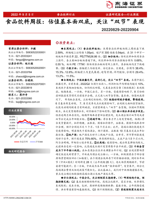 【东海证券】【20220905】20220905-东海证券-食品饮料周报:估值基本面双底,关注“双节”表现-18页 行业研究