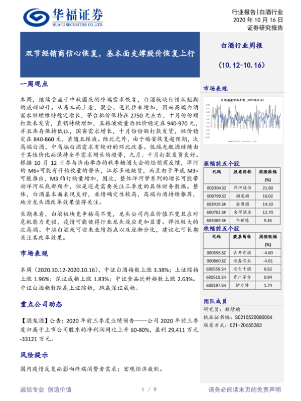 【华福证券】【20201016】20201016-华福证券-白酒行业周报:双节经销商信心恢复,基本面支撑股价恢复上行-9页 行业研究