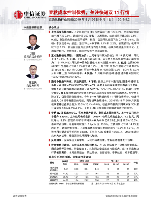 【中信证券】【20190902】交通运输行业周报:春秋成本控制优秀,关注快递双11行情-27页 行业研究