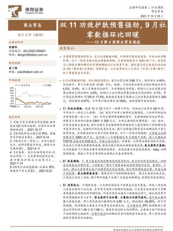 【德邦证券】【20211025】10月第4周商业贸易周报:双11功效护肤预售强劲,9月社零数据环比回暖-18页 行业研究
