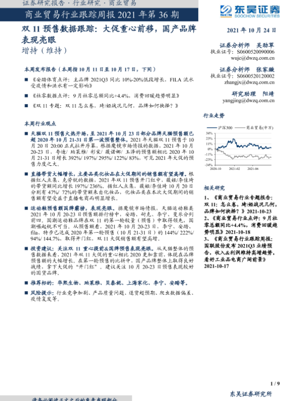 【东吴证券】【20211024】商业贸易行业跟踪周报2021年第36期:双11预售数据跟踪:大促重心前移,国产品牌表现亮眼-9页 行业研究