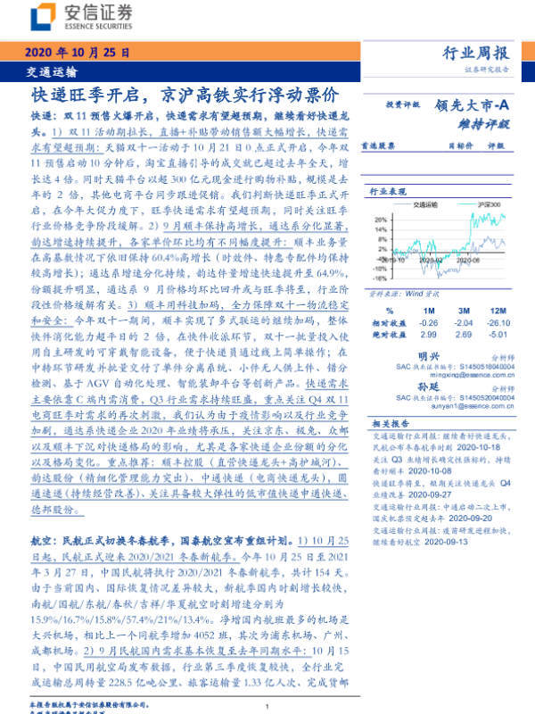 【安信证券】【20201025】交通运输行业周报:快递旺季开启,京沪高铁实行浮动票价-19页 行业研究