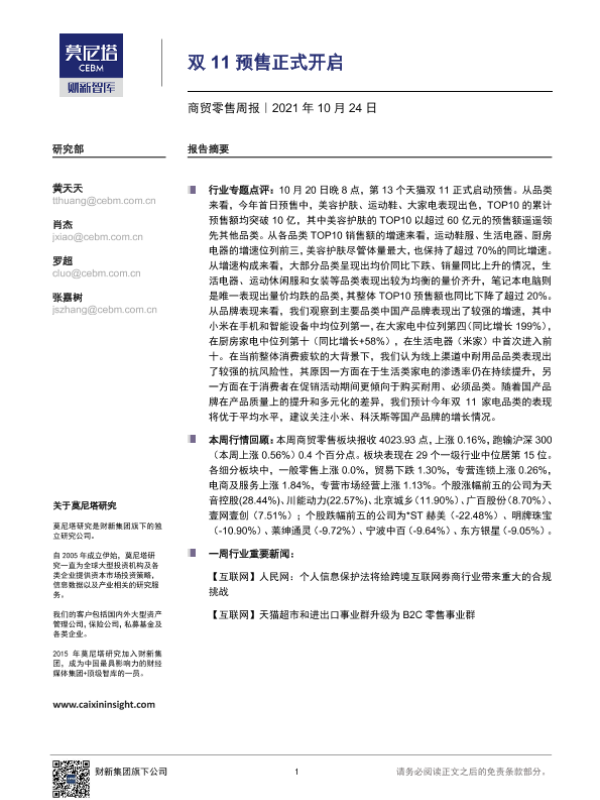 【莫尼塔研究】【20211024】双11预售正式开启-6页 行业研究