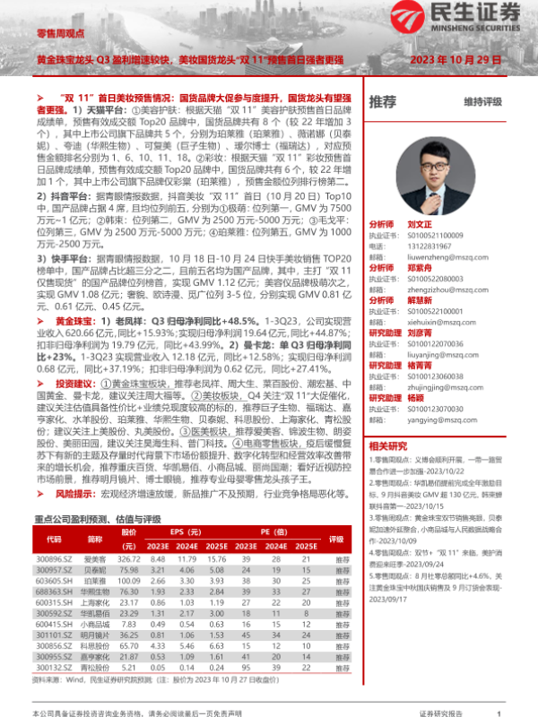 【民生证券】【20231029】零售周观点:黄金珠宝龙头Q3盈利增速较快,美妆国货龙头“双11”预售首日强者更强-28页 行业研究