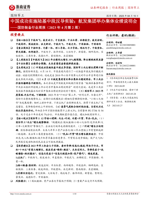 【浙商证券】【20230415】国防装备行业周报(2023年4月第2周):中国成功实施陆基中段反导实验;航发集团举办集体业绩说明会-10页 行业研究