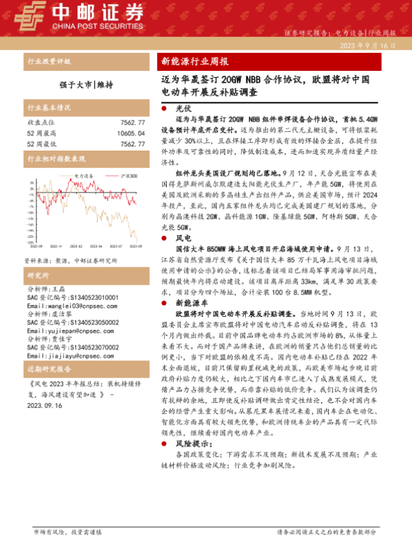 【中邮证券】【20230916】20230916-中邮证券-新能源行业周报:迈为华晟签订20GW NBB合作协议,欧盟将对中国电动车开展反补贴调查-19页 行业研究