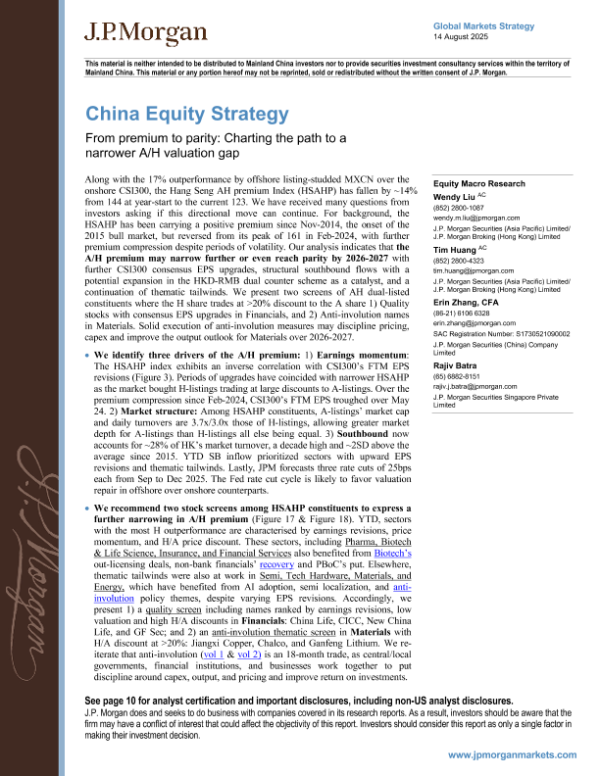 【J.P. Morgan】【202508】China Equity Strategy From premium to parity Charting the path to a narrower A/H valuation gap-15页 证券期货研究报告