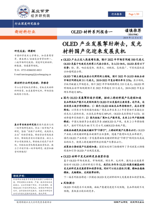 【基业常青经济研究院】【20191206】OLED材料系列报告一:OLED产业发展掣肘渐去,发光材料国产化迎来发展良机-20页 行业研究