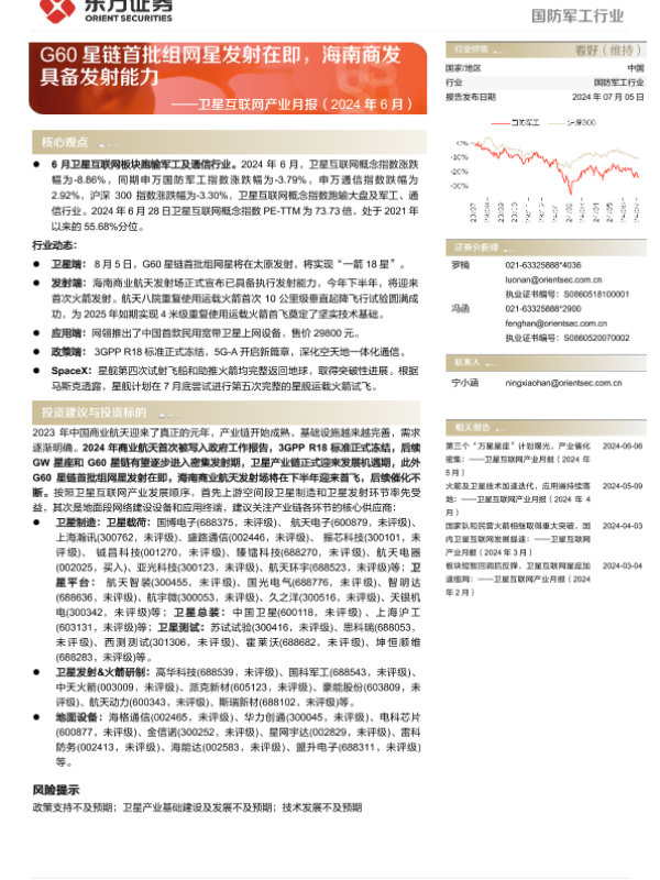 【东方证券】【20240705】国防军工行业卫星互联网产业月报(2024年6月):G60星链首批组网星发射在即,海南商发具备发射能力-15页 行业研究