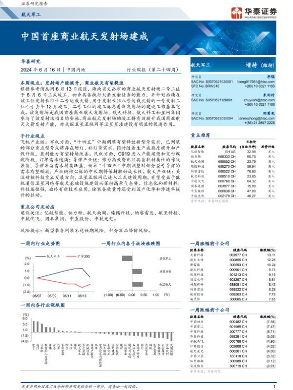 【华泰证券】【20240616】20240616-华泰证券-航天军工行业周报(第二十四周):中国首座商业航天发射场建成-15页 行业研究