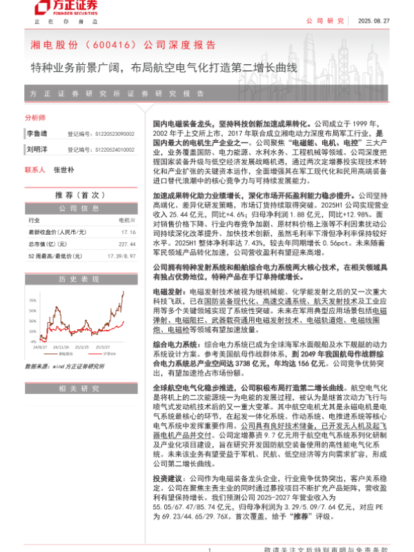 【方正证券】【202508】湘电股份( 6 0 0 4 1 6)公司深度报告 特种业务前景广阔,布局航空电气化打造第二增长曲线-39页 证券期货研究报告