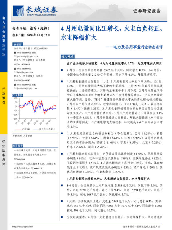 【长城证券】【20200517】4月用电量同比正增长,火电由负转正、水电降幅扩大-12页 行业研究