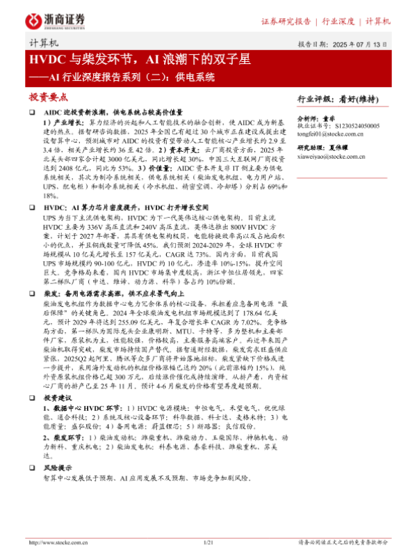 【浙商证券】【20250713】AI行业深度报告系列(二):供电系统;HVDC与柴发环节,AI浪潮下的双子星-21页 证券期货研究报告