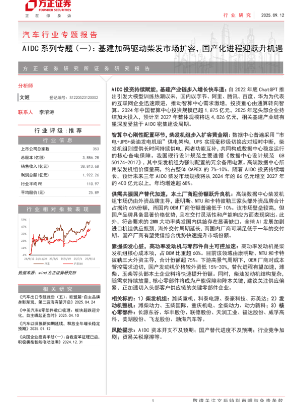【方正证券】【202509】汽车行业专题报告-AIDC系列专题(一):基建加码驱动柴发市场扩容,国产化进程迎跃升机遇-13页 证券期货研究报告