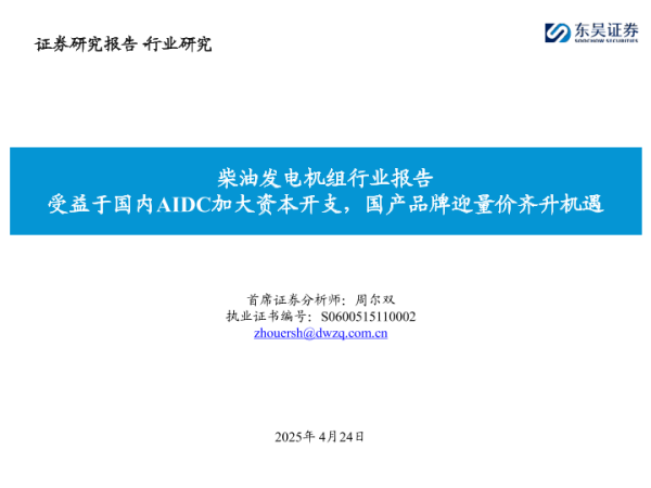 【东吴证券】【20250424】柴油发电机组行业报告:受益于国内AIDC加大资本开支,国产品牌迎量价齐升机遇-41页 行业研究