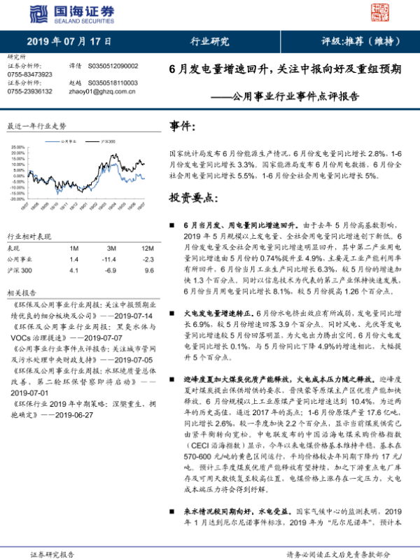 【国海证券】【20190717】6月发电量增速回升,关注中报向好及重组预期-4页 行业研究