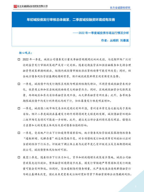 【东方金诚】【20220424】2022年一季度城投债市场运行情况分析-15页 行业研究