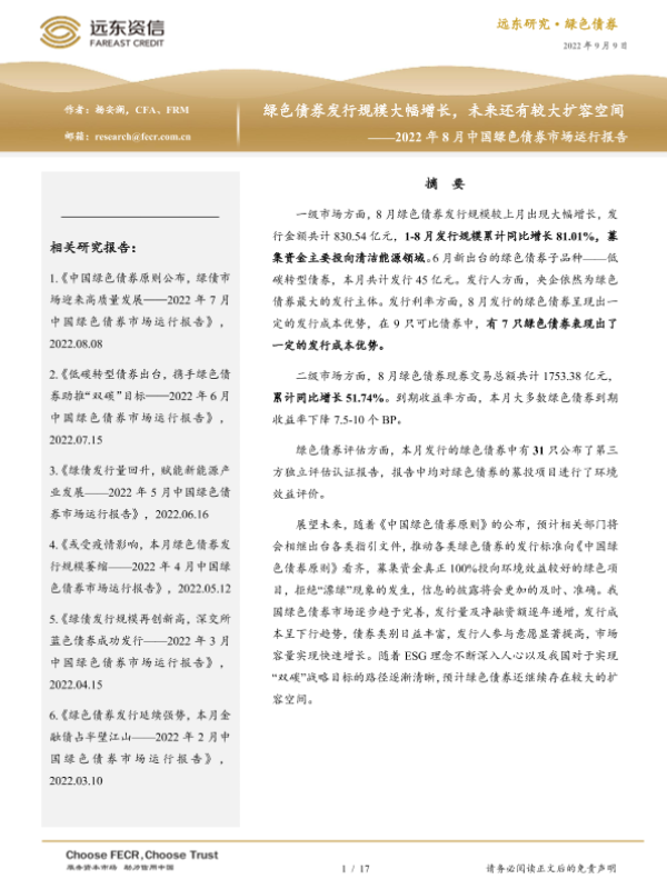 【远东资信】【20220909】2022年8月中国绿色债券市场运行报告:绿色债券发行规模大幅增长,未来还有较大扩容空间-17页 行业研究