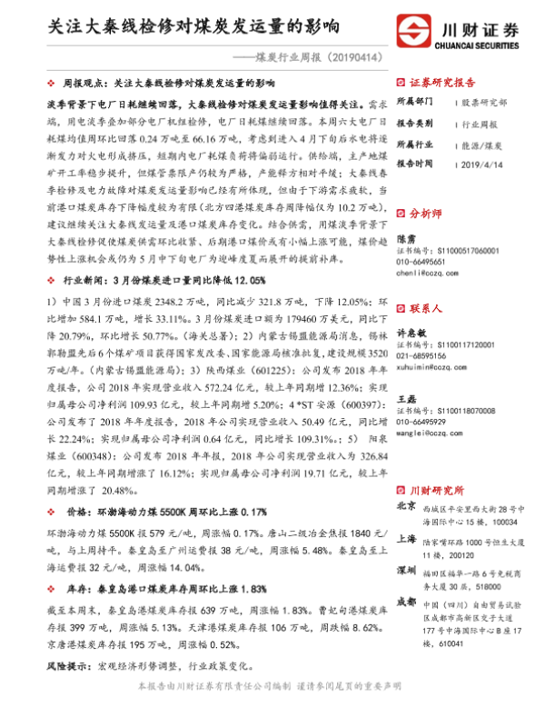 【川财证券】【20190414】煤炭行业周报:关注大秦线检修对煤炭发运量的影响-14页 行业研究