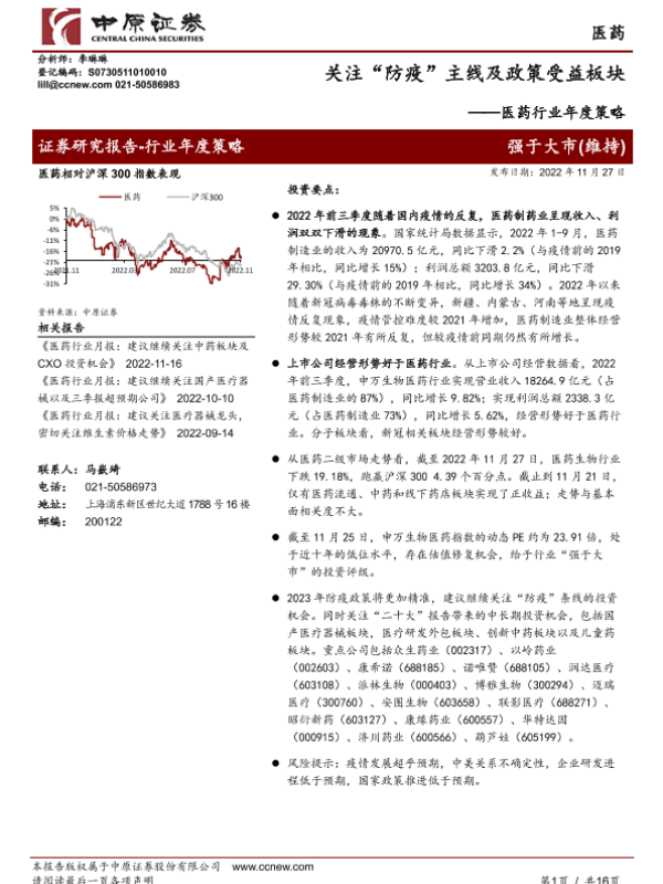 【中原证券】【20221127】医药行业年度策略:关注“防疫”主线及政策受益板块-16页 行业研究