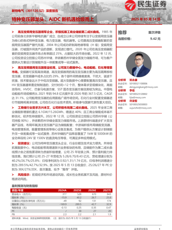 【民生证券】【20250514】新特电气(301120)深度报告:特种变压器龙头,AIDC新机遇拾级而上-23页 证券期货研究报告