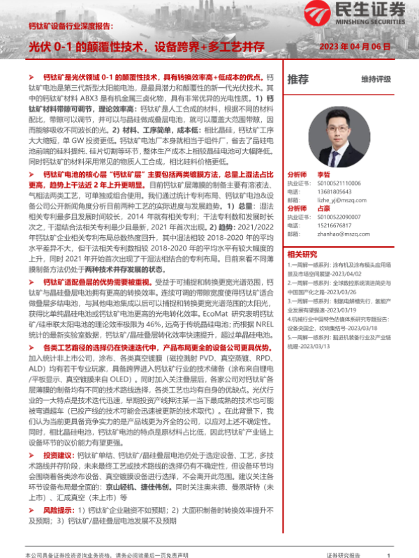 【民生证券】【20230406】钙钛矿设备行业深度报告:光伏0_1的颠覆性技术,设备跨界+多工艺并存-67页 行业研究