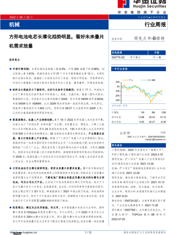 【华金证券】【20220822】机械行业周报:方形电池电芯长薄化趋势明显,看好未来叠片机需求放量-12页 行业研究