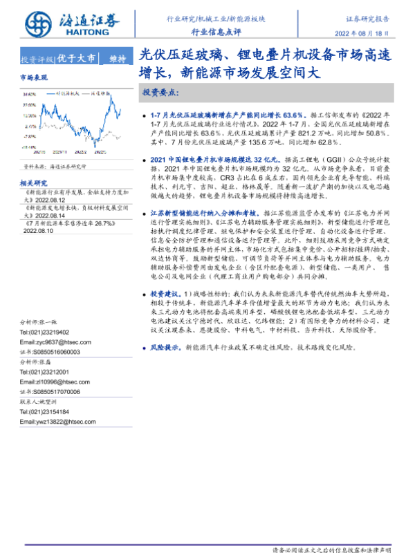 【海通证券】【20220818】机械工业行业信息点评:光伏压延玻璃、锂电叠片机设备市场高速增长,新能源市场发展空间大-2页 行业研究