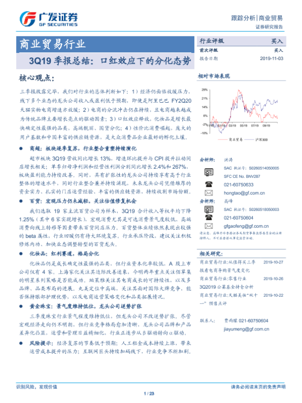 【广发证券】【20191103】商业贸易行业3Q19季报总结:口红效应下的分化态势-23页 行业研究