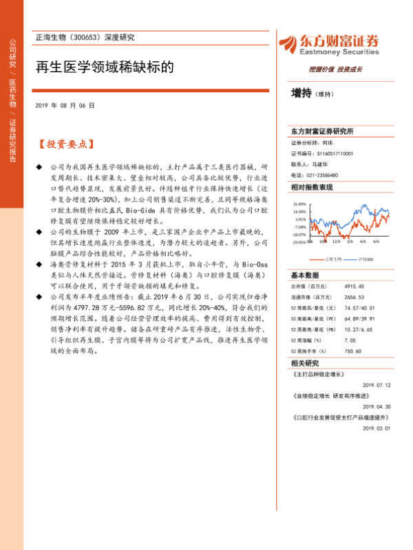 【东方财富证券】【20190806】正海生物-300653.SZ-深度研究:再生医学领域稀缺标的-27页 行业研究