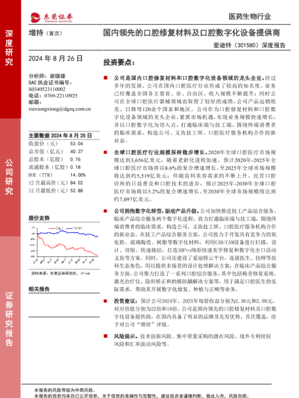 【东莞证券】【20240826】爱迪特(301580)深度报告:国内领先的口腔修复材料及口腔数字化设备提供商-20页 行业研究
