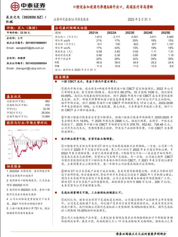 【中泰证券】【20230331】美亚光电002690.SZ口腔设备加速国内渗透&海外出口,高端医疗布局清晰-31页 行业研究