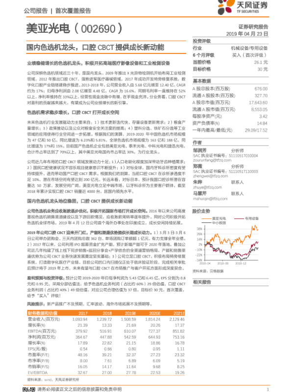 【天风证券】【20190423】美亚光电-国内色选机龙头,口腔CBCT提供成长新动能-27页 行业研究