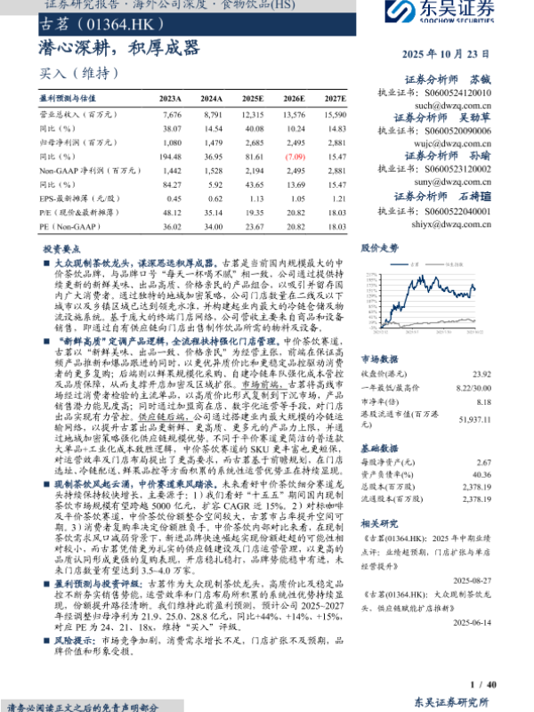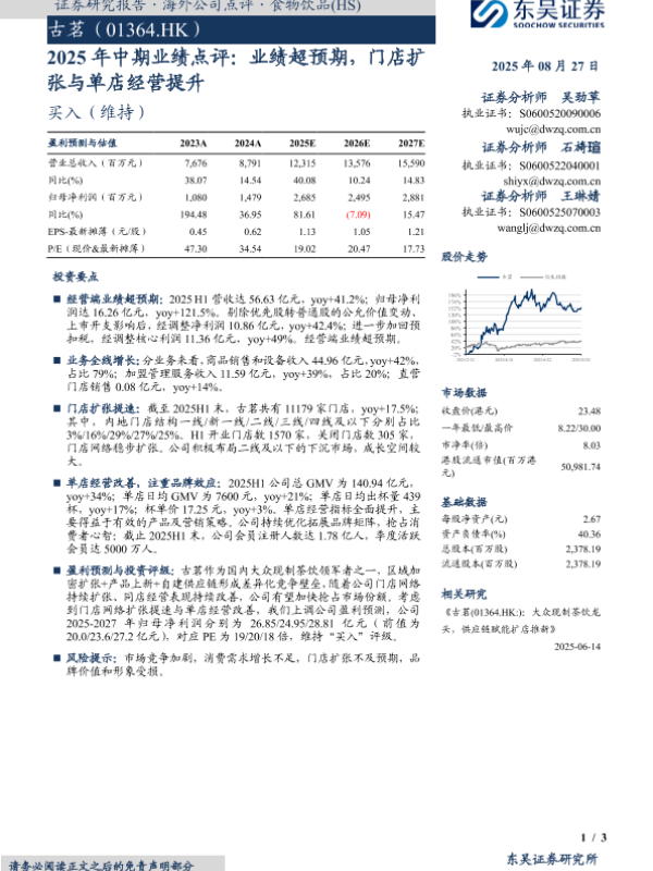 【东吴证券】【20250827】古茗-2025年中期业绩点评-业绩超预期-门店扩张与单店经营提升-3页 证券期货研究报告