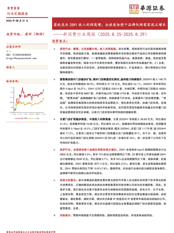 【华源证券】【20250831】蜜雪集团-新消费行业周报_茶饮龙头25H1收入利润高增;全球美妆前十品牌仅两家实现正增长-7页 证券期货研究报告