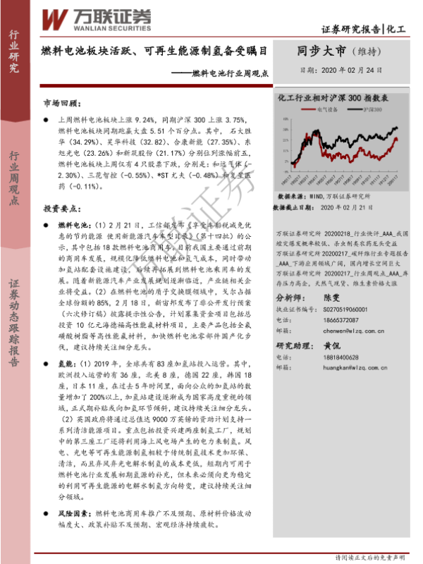 【万联证券】【20200224】燃料电池行业周观点:燃料电池板块活跃、可再生能源制氢备受瞩目-7页 行业研究