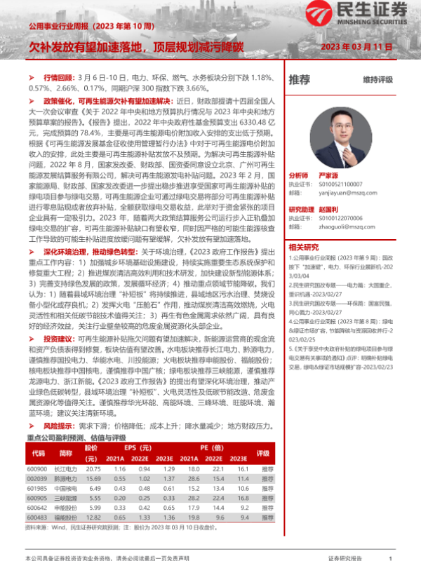 【民生证券】【20230311】公用事业行业周报:欠补发放有望加速落地,顶层规划减污降碳-24页 行业研究