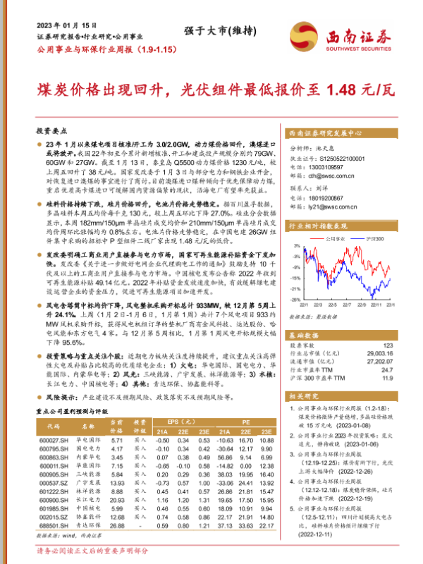 【西南证券】【20230115】公用事业与环保行业周报:煤炭价格出现回升,光伏组件最低报价至1.48元/瓦-25页 行业研究