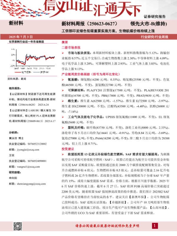 【山西证券】【20250703】新材料周报:工信部印发绿色低碳重要实施方案,生物航煤价格持续上涨-23页 行业研究