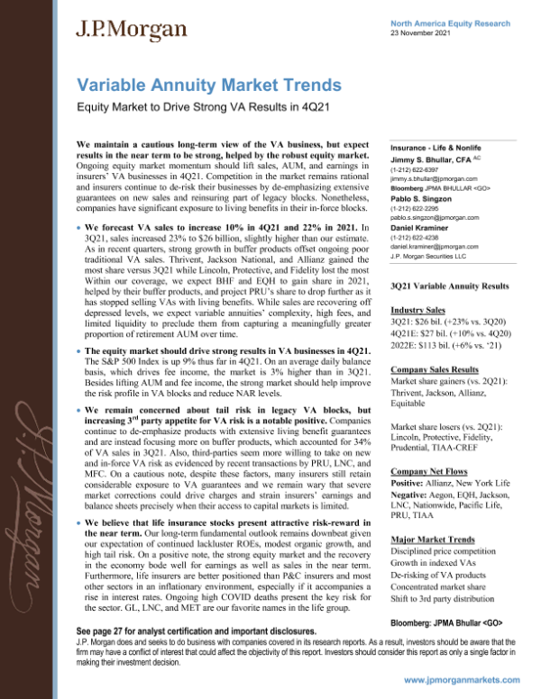 【J.P. Morgan】【20211123】美股保险行业可变年金市场趋势:股票市场将推动2021年第四季度的强劲增值业绩-30页 行业研究