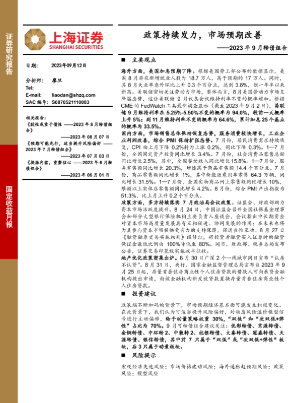 【上海证券】【20230912】2023年9月转债组合:政策持续发力,市场预期改善-15页 行业研究