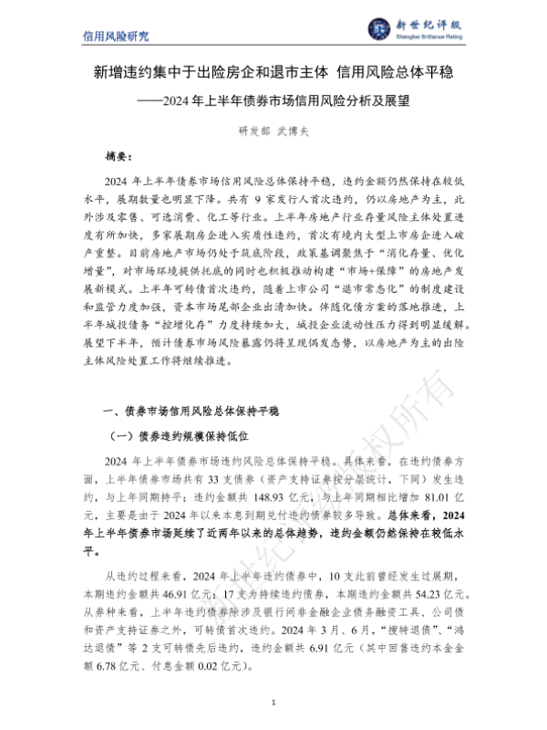 【研发部 武博夫】【20240101】新增违约集中于出险房企和退市主体 信用风险总体平稳——2024年上半年债券市场信用风险分析及展望-12页 行业研究
