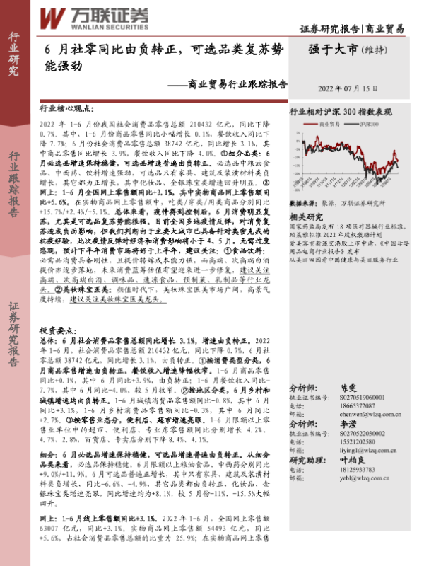 【万联证券】【20220715】6月社零同比由负转正,可选品类复苏势能强劲-10页 行业研究