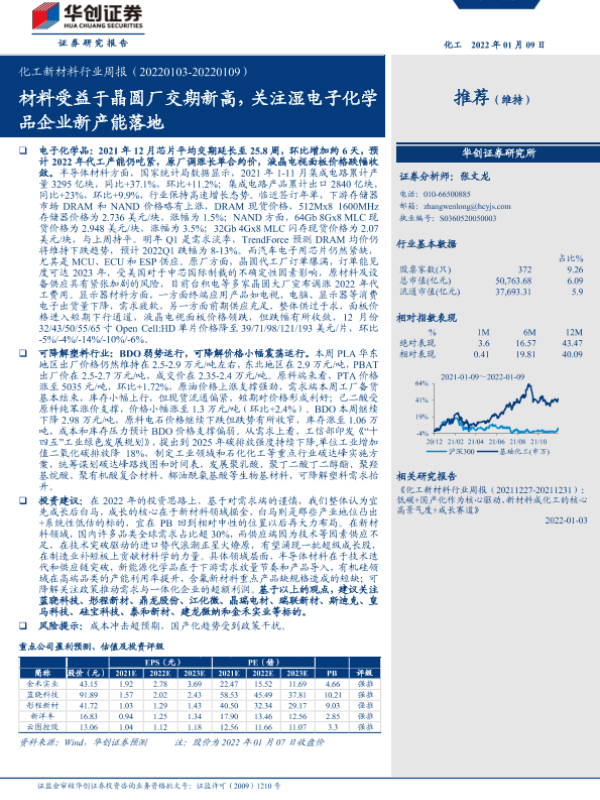 【华创证券】【20220109】化工新材料行业周报:材料受益于晶圆厂交期新高,关注湿电子化学品企业新产能落地-29页 行业研究