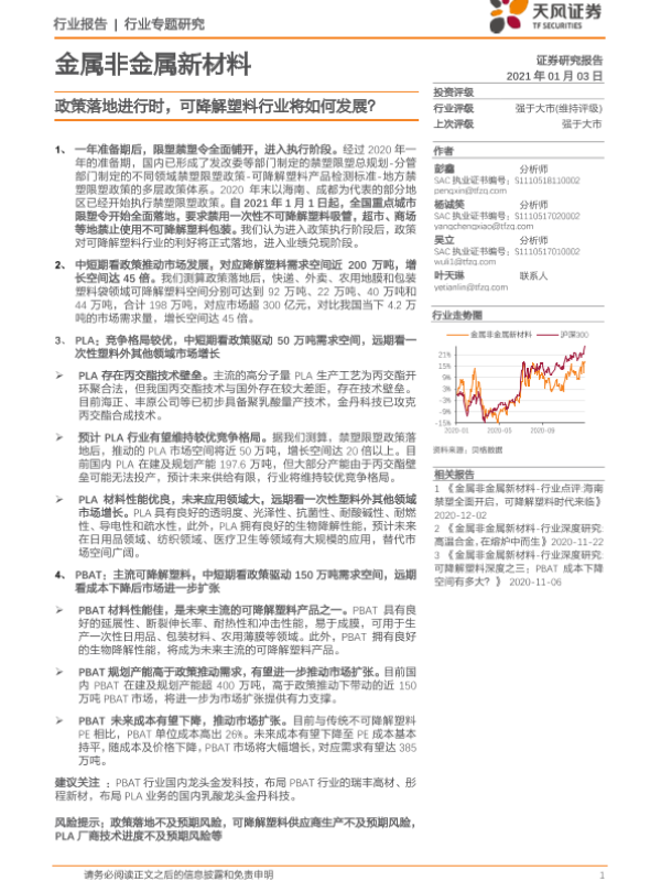 【天风证券】【20210103】金属非金属新材料行业专题研究:政策落地进行时,可降解塑料行业将如何发展?-23页 行业研究