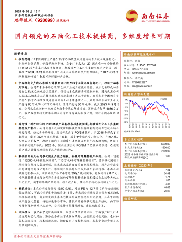 【西南证券】【20240913】瑞华技术(920099)国内领先的石油化工技术提供商,多维度增长可期-34页 行业研究