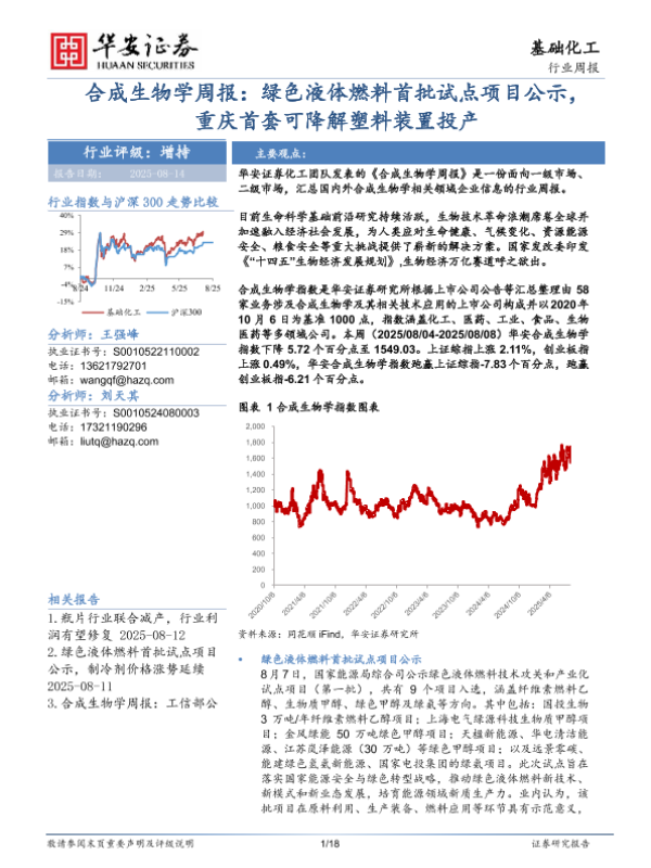 【华安证券】【20250814】合成生物学周报:绿色液体燃料首批试点项目公示,重庆首套可降解塑料装置投产-18页 行业研究