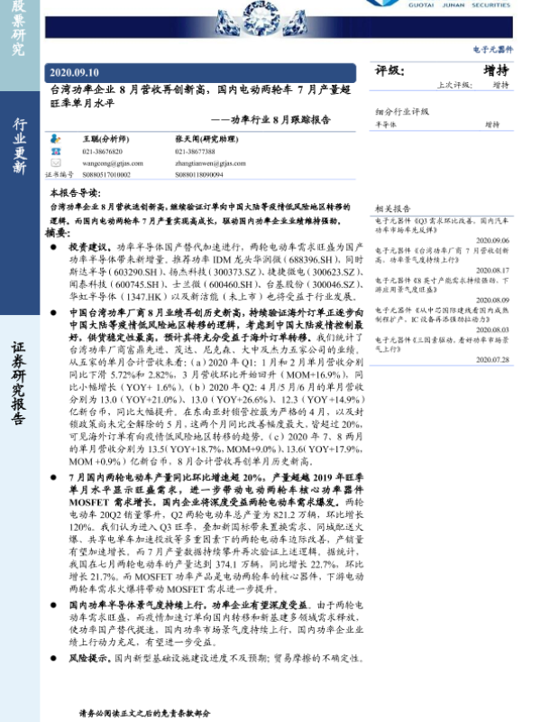 【国泰君安证券】【20200910】功率行业8月跟踪报告:台湾功率企业8月营收再创新高,国内电动两轮车7月产量超旺季单月水平-3页 行业研究